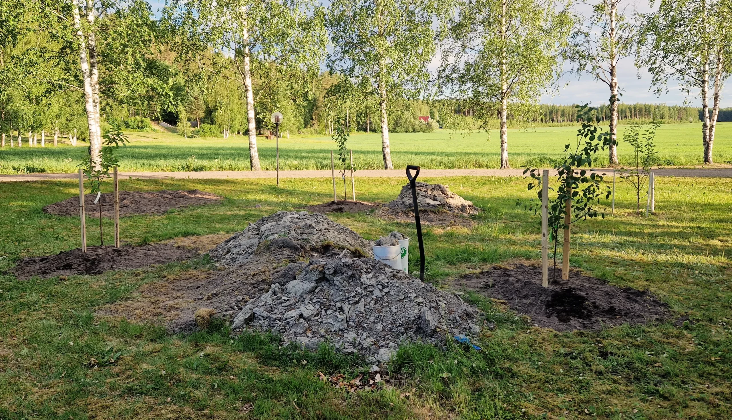 Juhannuspäivänä on hyvä aika tehdä keskenjääneitä pihatöitä ystävä-avun saattelemana. Vasemmalta oikealle istutettu: Leningrad musta kirsikka, Victoria luumu, perheomena ja kaneliomena. Niiden välissä himmeet savikasat joille pitäis vielä jaksaa tehdä jotain.