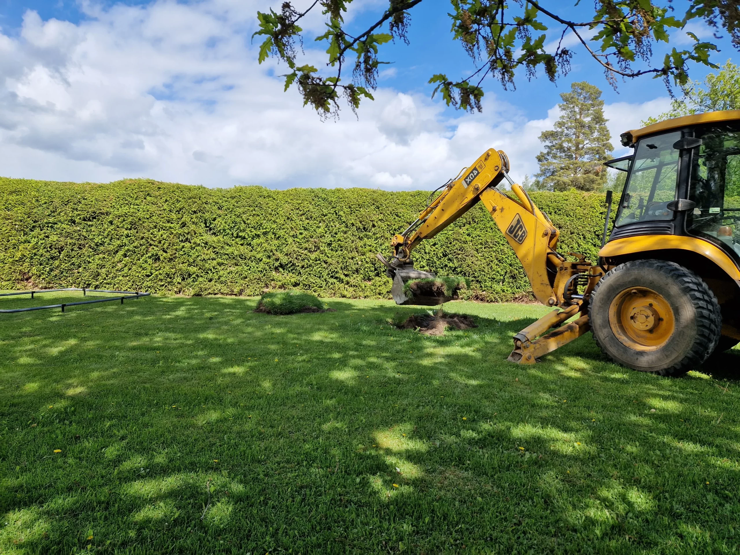 Naapuri kävi kaivamassa hiukan omenapuille ja trampoliinille kuoppia pihaan. Poistuessaan pihasta ryhtyi samalla satamaan joten pomput saa odottaa iltaa tai viikonloppua 🙂