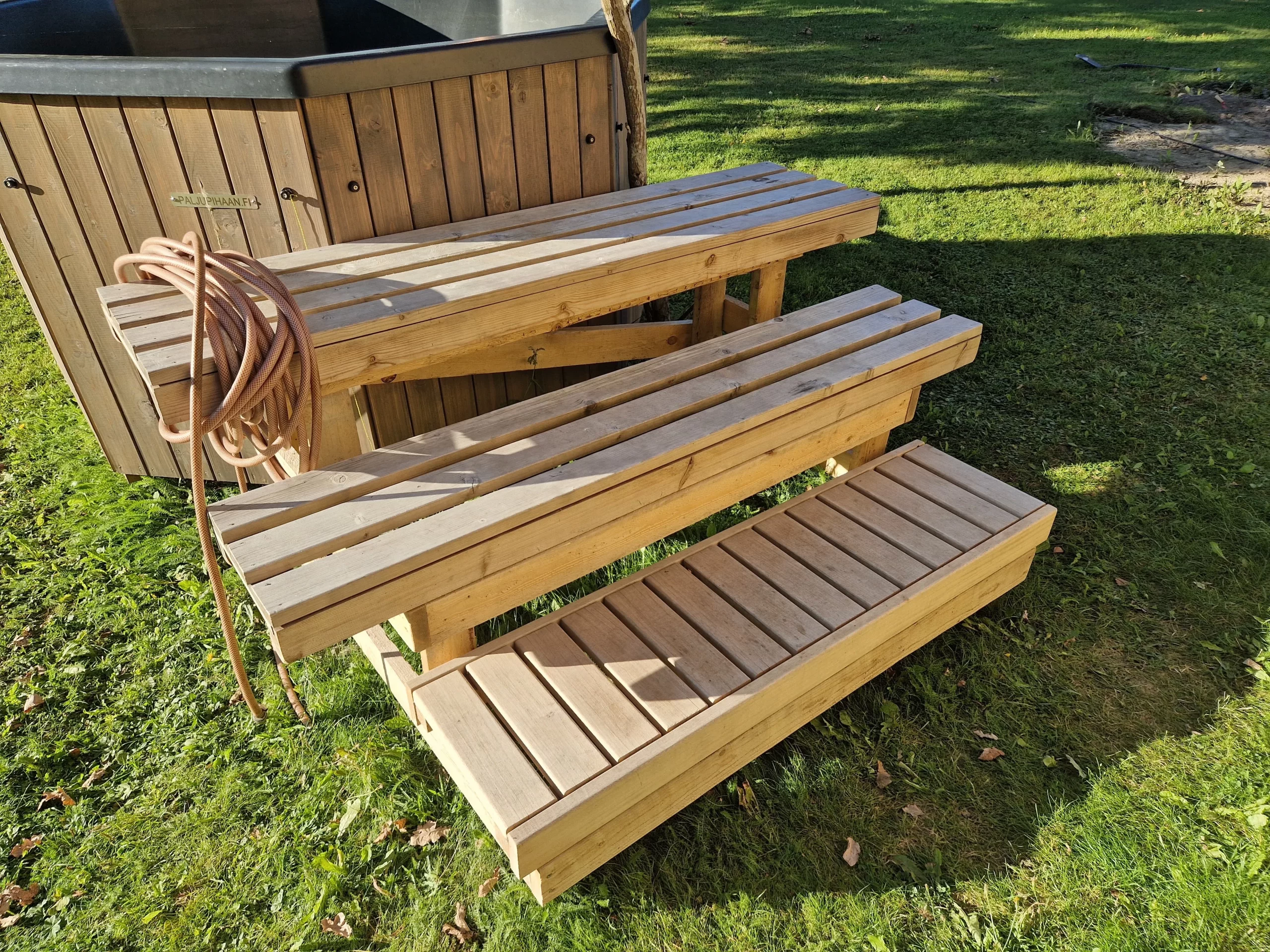 Nämä oli heti toka asia jotka rakensin kun olin saanut ladon työpöydät valmiiksi. Vanhat lauteet olivat navetan yläkerrasta löydetyt tosi kiikkurat väkerrelmät. Nämä uudet on nyt sitten samaiset lauteet + Onnin vanhan saunan yksi laude lisänä ja upouusi tukeva tukikehikko.