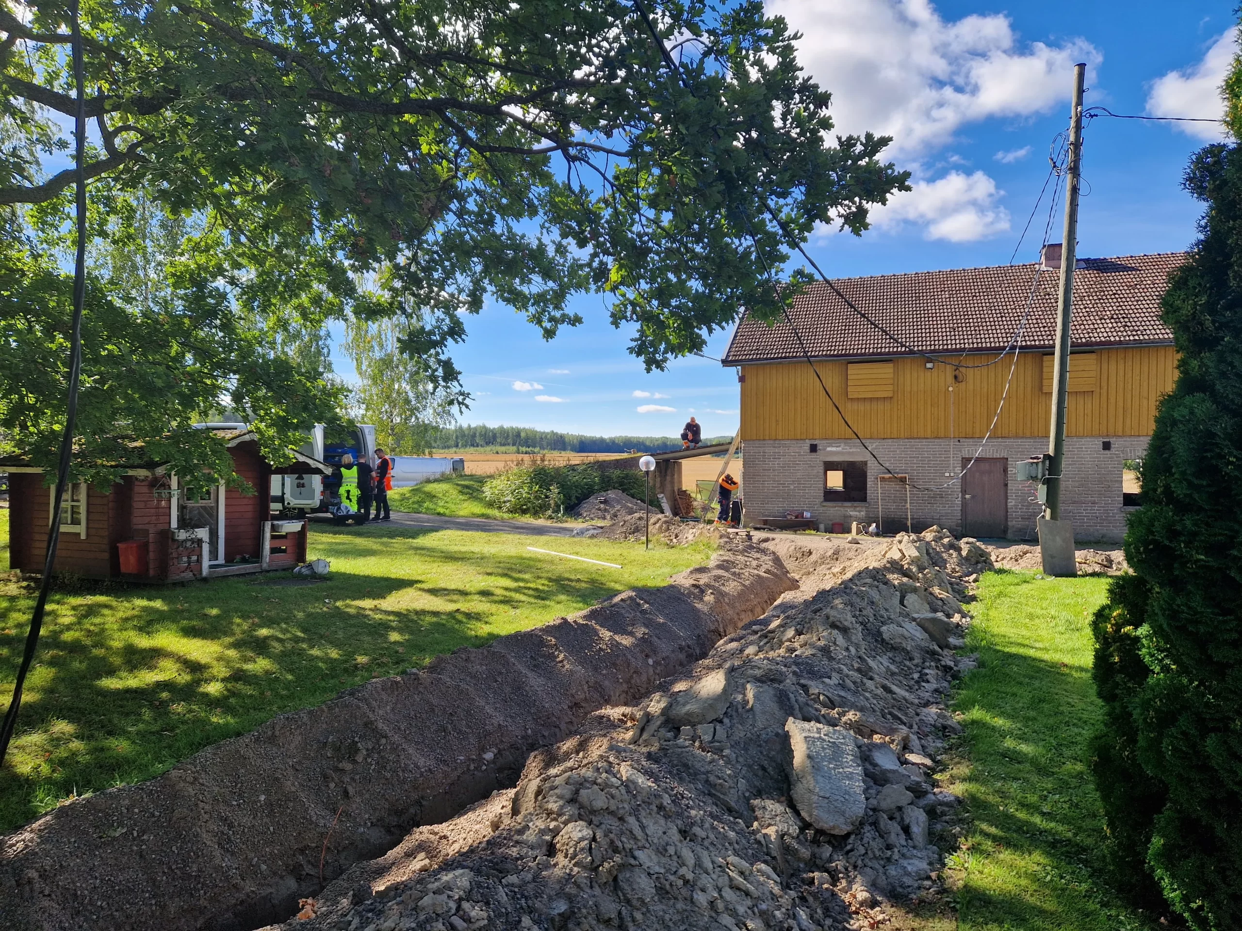 Siinä se vanha kaapelikin roikkuu tammen oksalla! Onpas jännää miten paljon meidän pihan ilme tulee muuttumaan kun kaikki sähköt upotetaan maihin ja tuo keskustolppa poistuu.