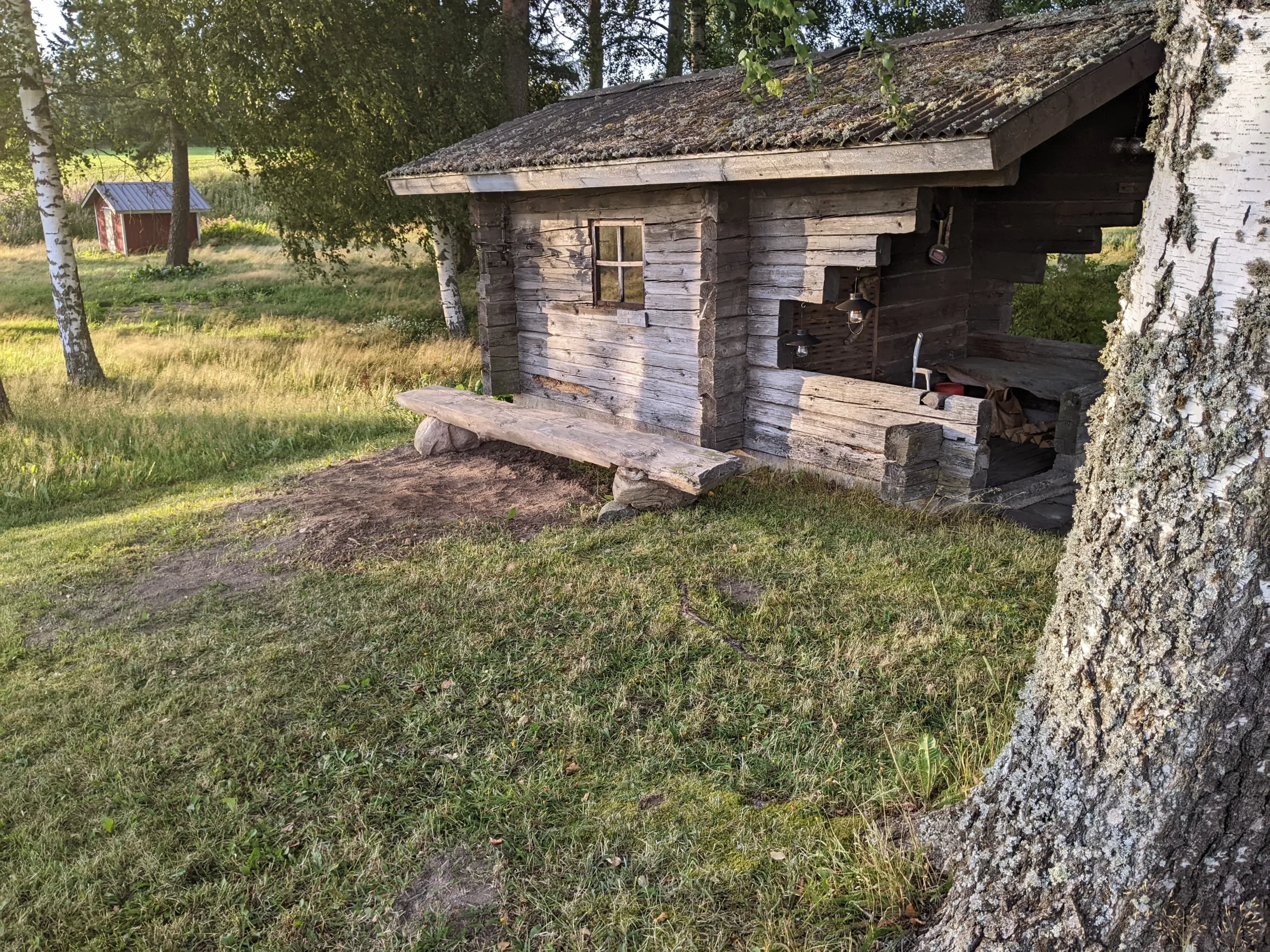 Vieressä ollut kapinen joku piikkipuska poistettu ja tuulensuojana käytetyt alkuperäiset pressut poistettu. Pitäisi vielä penkin alle asettaa betonilaatat niin pysyy varpaat puhtaana vilvoitellessa.
