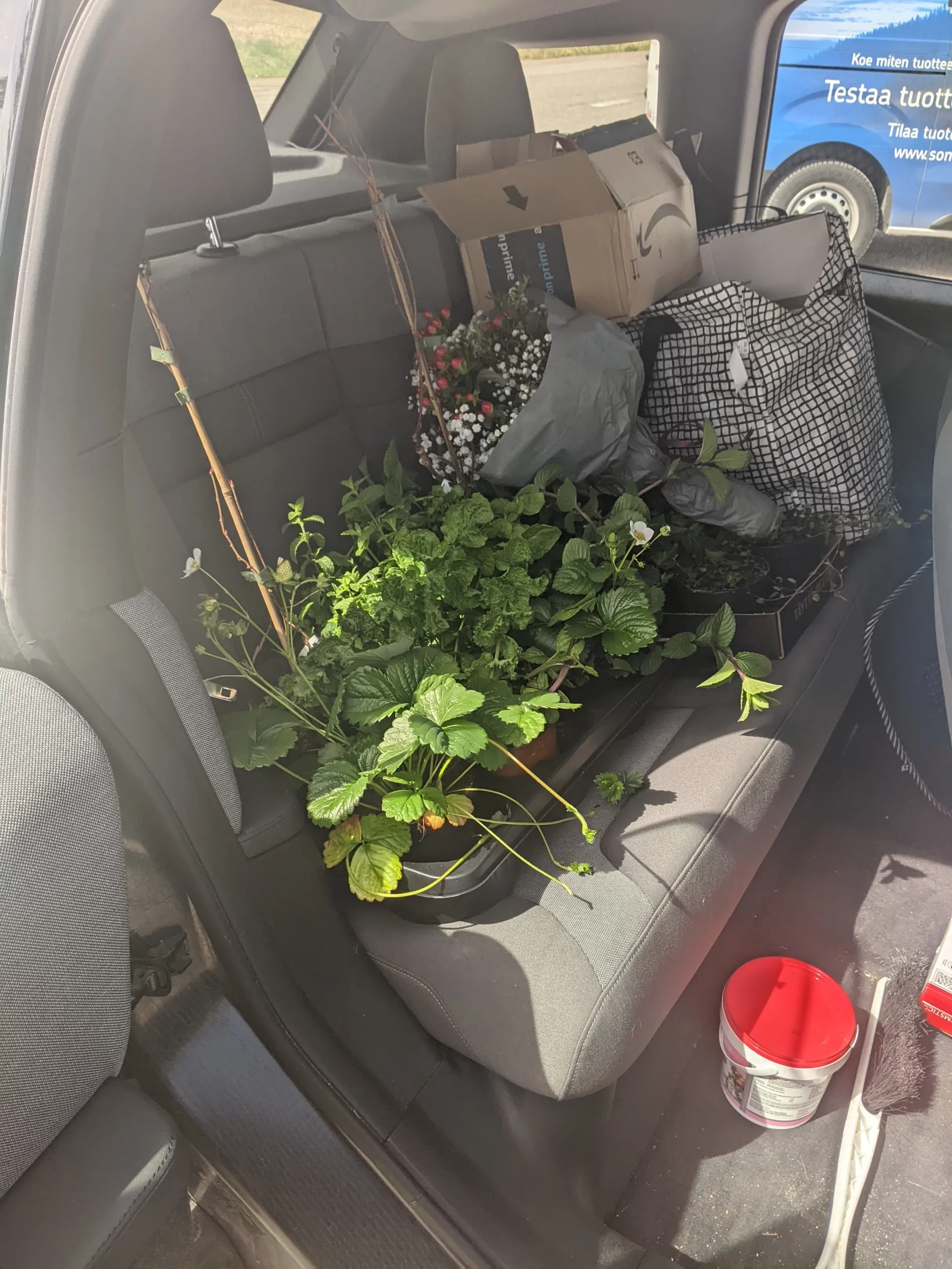 No kuolleiden kasvien tilalle piti sitten jotai ostella. Asiat lähti ns. hanskasta. Sieltä sitten löytyi amppelimansikkaa, neljää erilaista minttua, kastejuhlaan kukkia, muratit ja ja ja….