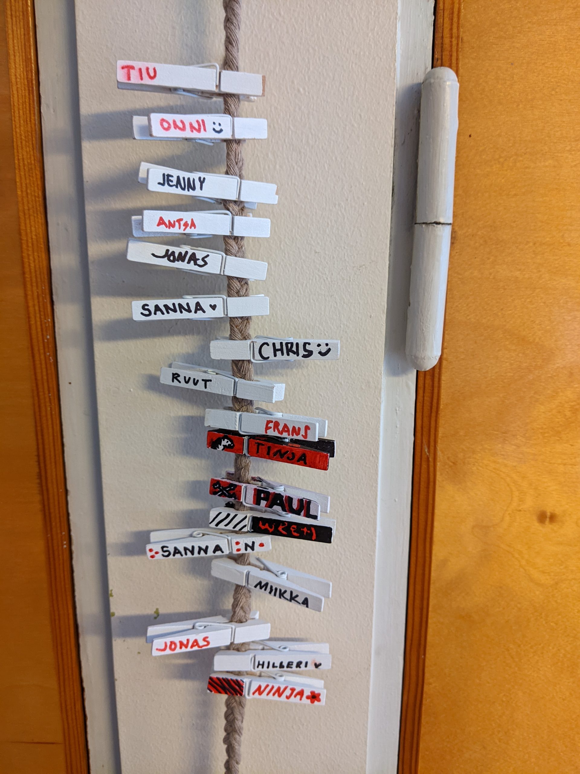Meillä on alusta asti ollut hiukan hankalaa pitää kirjaa siitä mikä muki tai lasi kuuluu kellekkin, varsinkin jos paikalla on enemmänkin vieraita. Keksin siis tällaisen lasimerkkistrategian joka toimii samalla myös vieraskirjana. Jokainen uusi vierailija saa ensitöikseen laittaa päivämäärän ylös kun ensin kävi täällä ja oman nimensä ja pitää huolta että käyttämänsä lasiin on tuo nappastu kiinni vierailunsa ajaksi. On ollut yllättävän toimiva ratkaisu!