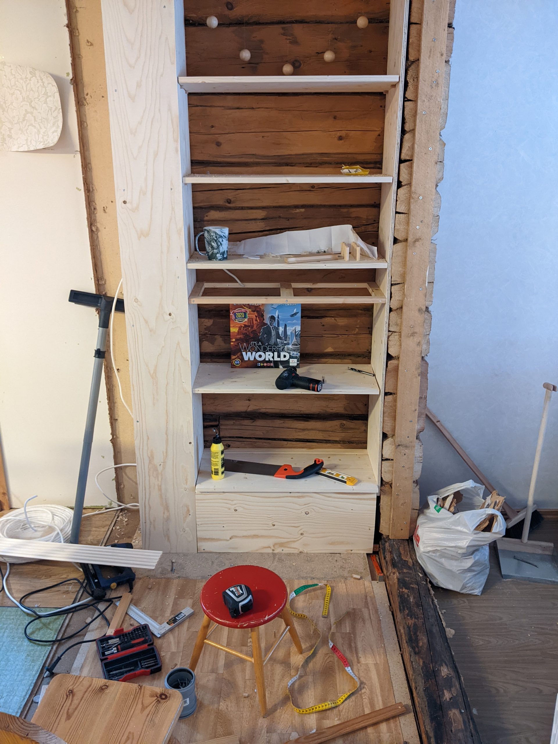Sain kauniisti tonne vasempaan palkkiin piiloon sen yläkerran viemäriputken. Tungin kehikon aivan tiukkatäyteen ekovillaa ja siihen tulee tuon vanerin lisäksi päälle vielä sormipanelointi. Todella mukavasti se vaimensin vessanvedosta tulleet lorinat pois niin, että ei enää häiritse ruokahalua.