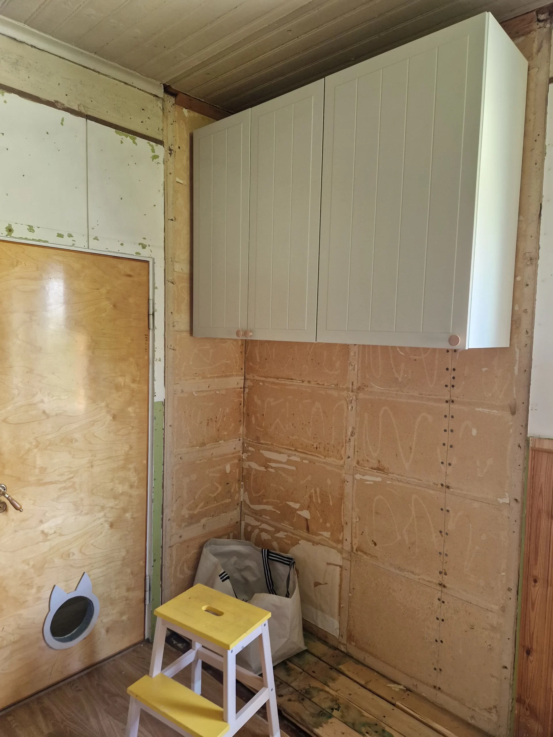 Nämä kaapit keittiön nurkassa syövät sisäänsä kaiken ja vähän päälle, minkä pitää olla käden ulottuvilla mutta jota tarvitaan harvemmin. Tähän tulee ulkoreunoille vielä helmipaneli ja yläpuolelle sokkeli ja kulmalistat. Kaappien ”välitilaan” tulee roikkumaan pannut ja parit kattilat. Alle voi sitten rullata tuon meidän keittiön saarekkeen jos tarvii saada lisää tilaa keskelle keittiötä.