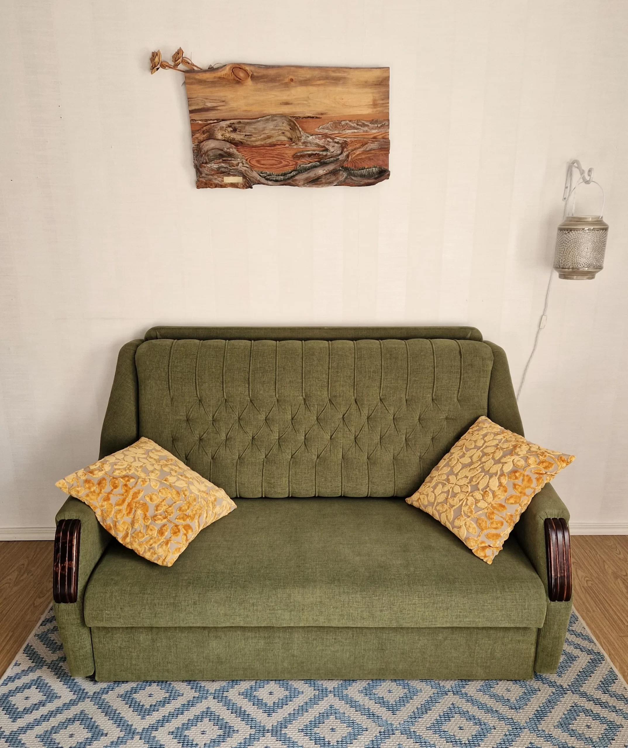 Nyt sitten mullekkin tällainen ihme siunaantui eteen. Olin ennen tämän kaunokaisen löytämistä saanut juuri hyväksynnän facebookissa vanhojen kalusteiden entisöinti ja myynti-ryhmään. Tunti ryhmään tulon jälkeen joku ilmoitti tämän vintage sänkysohvan 80€ myytäväksi! Siis mitä, se on täydellisessä kunnossa, täydellisen värinen, täydellisen kokoinen, täydellisellä säilytyslaatikolla ja aukeaa juuri oikeanlaisella mekanismilla oikeaan suuntaan. Olin kolunut internetin läpi näillä spekseillä viime talvena ja halvin mitä löysin alkoi 1000 eurosta ja niistäkin puuttui aina joku väri tai koko tai malli.