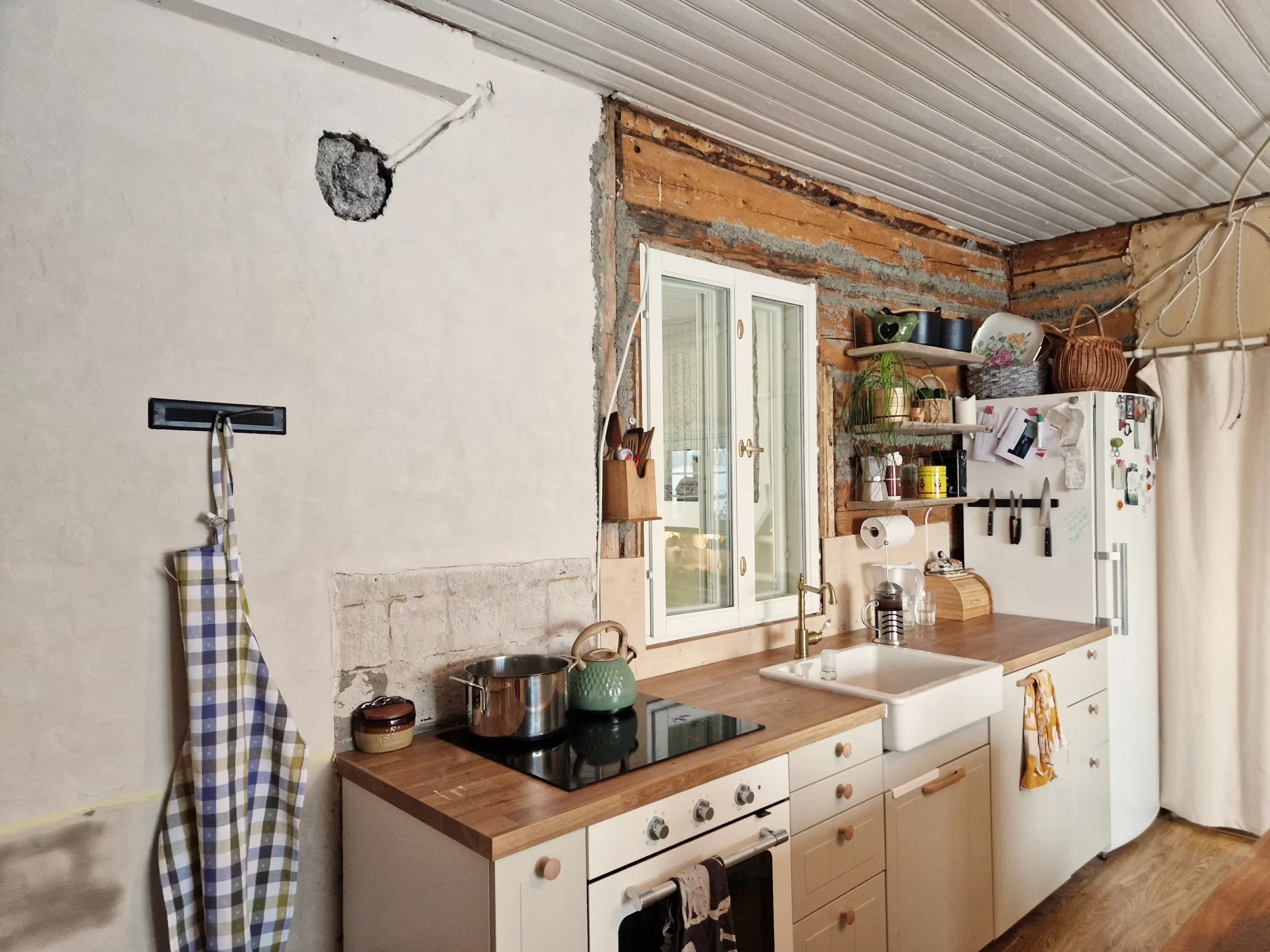 Tässä kohtaa nyt ollaan. Seuraavaksi alkaa tuo loppuseinän laastaus ja välitilan taustalevyn kuntoon laitto. Tulee kyllä niin paljon harmonisempi kun saa yhtenäisen seinän.