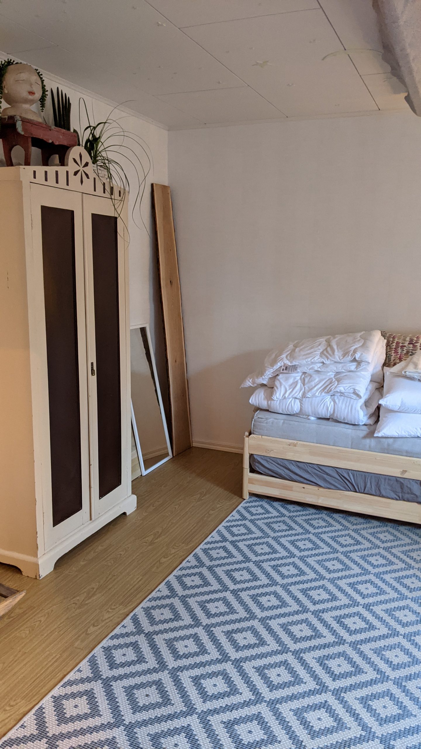 Vähän on sisustustakin. Sain ostettua tori.fistä ihanan vintagekaapin tuon vanhan oviaukon kohdalle. Toki sekä aukossa, että kaapissa on vielä restauroitavaa ja parannettavaa, mutta tällä hetkellä tämä on taas sarjassamme ”ei valmis mutta toimii”. Tämä huone on kuitenkin pääasiallisesti vain vierashuoneena käytetty, ja ajoittain tuon esikoisen päiväunia varten.