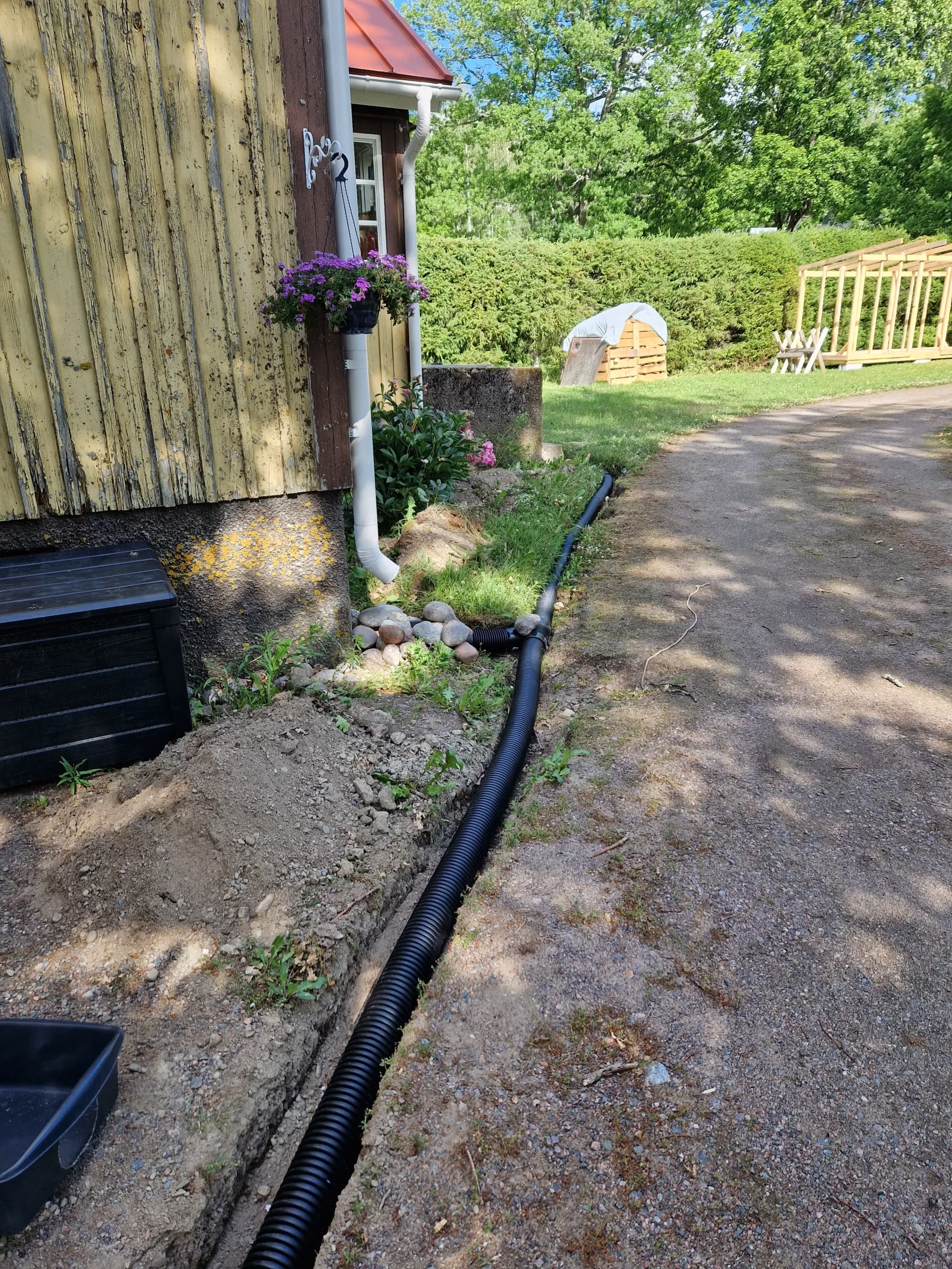 Tässä projektissa on kulunut jo yli vuosi 😀 Viime kesänä kaivautin pojilla ojat auki mutta sitten se vaan jäi kun olisi Salon Puuilosta asti pitänyt lähteä hakemaan haluamiani Rotomon sadevesiputkia. Nyt kuitenki Nummelaan avattiin kesällä Puuilo niin ei ollut enää niin pitkä ajomatka niin sain kuin sainkin tilattua putket.