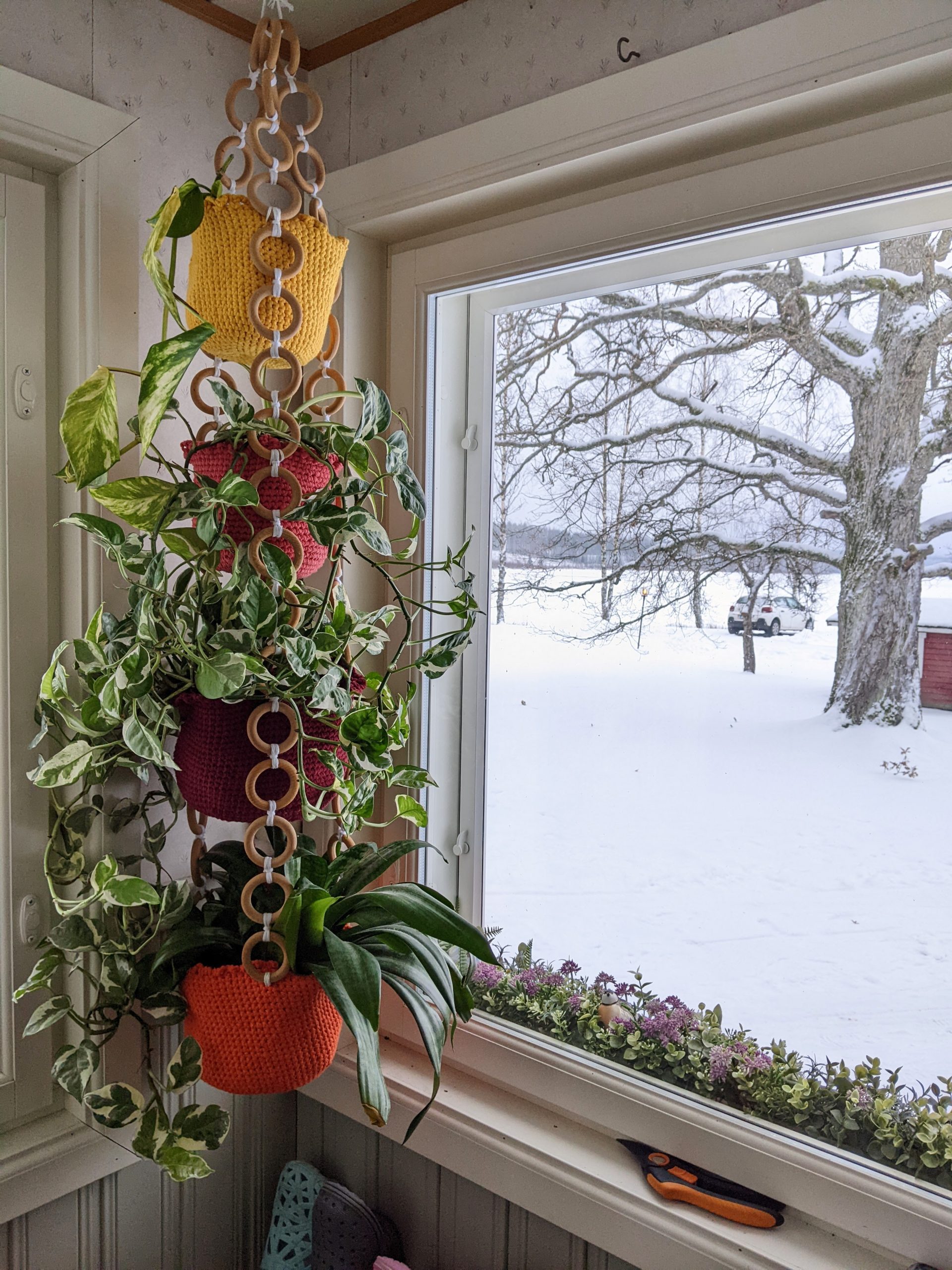 Sain tuonne meidän Ikuisen kesän-eteiseen virkattua amppelitelineen. Tulee sopimaan väritykseltään oikein mainiosti eteiseen tulevaan tapettiin.