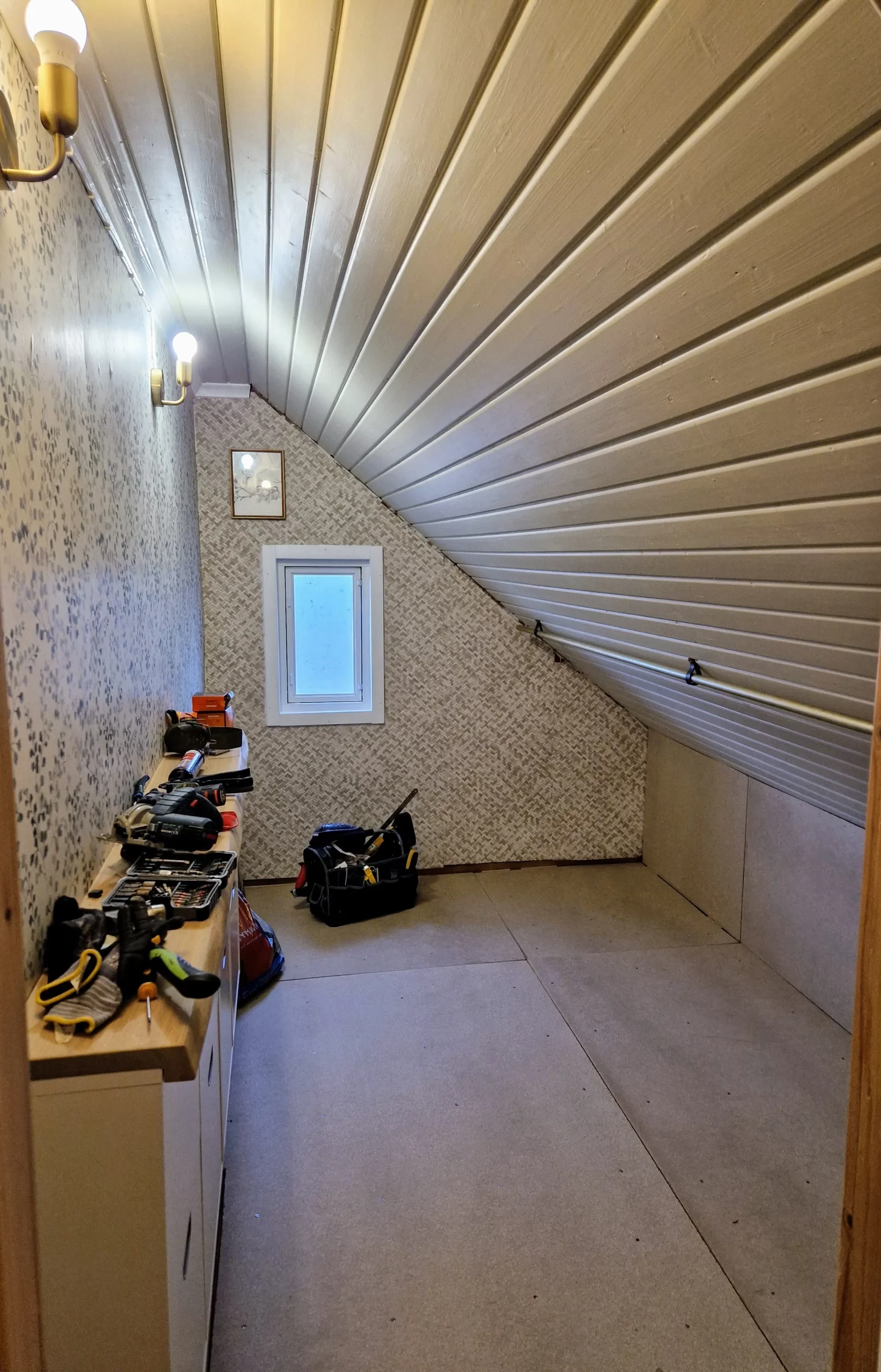 Nyt on enää jäljellä lattiapinnan asennus, peräseinän maalaus, listojen maalaus ja asennus sekä viimeiseksi, oma lemppari, autismin huipentuma – tavaroiden järjestely takaisin paikoilleen. Tosta tulee niiin timanttia. 💎